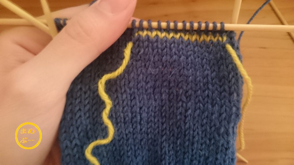 別糸で親指部分の穴用に編みましたが、マスタード色とネイビーの組み合わせが凄く合っていて、特に意味もなく余った毛糸を使っただけだったのに、嬉しい発見です♪