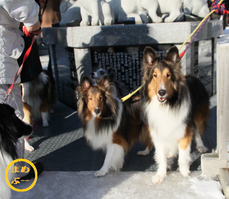 戻ると、石像の前でシェルティたちの撮影会に!
