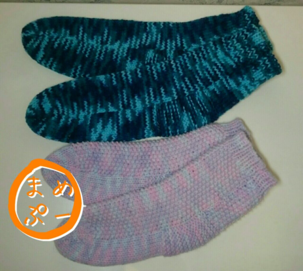 ルームソックスを編んで、とじ合わせる練習をしていますが、2足編めました。