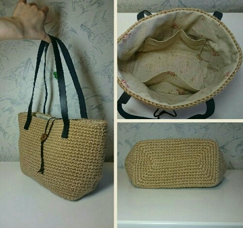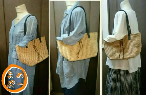 黒の本革持ち手で全体に締まりを持たせた麻ひものバッグです。